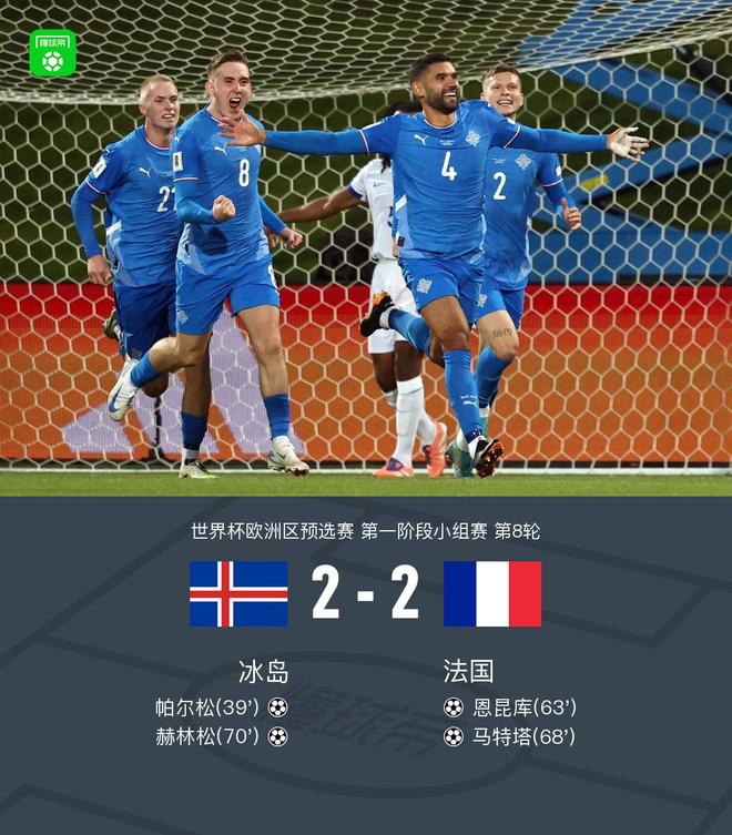 北京时间10月14日,2026年世界杯欧洲区预选赛小组赛第八天,冰岛队与法国队的比赛打响。上半场,佩尔森被挡,但射门成功。下半场,恩库库内切入破门扳平比分,阿克利亚什力压马塔,古德蒙德森助攻赫林森进球再次扳平比分。最终,两队握手言和,2-2战平。关键的第39分钟,帕森的第一脚射门被挡出,但他的第二脚射门却打进了球门!冰岛1-0法国第63分钟扳平比分!恩昆库带球进去,推射得分。冰岛1-1法国第68分钟领先!阿克里亚斯冲向球门,马塔成功突破,第70分钟,冰岛1-2法国回到同一起跑线。古德蒙德松推杆助攻赫林森得分,冰岛2-2法国。两支球队的球员都已经到场了。时间比赛第2分钟,恩昆库近距离破门。奥拉夫森用脚将球挡出。第15分钟,孔德突破防守起脚远射。第25分钟奥拉夫森丢球后获得机会,古德蒙德森射门打高。随后主裁判举旗示意越位。第36分钟,奥利塞获得任意球直接射门。奥拉夫森双手挡球。第39分钟,帕森第一脚射门被挡出,随后他再次射门入网。冰岛1-0法国 马格努森在第45分钟和第2分钟因膝伤被换下。威尔姆森在第45分钟和第4分钟替补上场。奥利塞头球攻门被挡出,马塔下一脚射门在对方门前被解围。第52分钟,陶万第一脚射门被破,他摇头将球打入球门。第58分钟,陶万尝试抽射,但皮球偏出。第63分钟我们打平!恩昆库带球射门得分,冰岛队1-1法国队获胜。第67分钟,迪涅外围远射。第68分钟,奥拉夫森传中。他一跃领先!阿克里亚斯冲向球门,马塔成功突破,第70分钟,冰岛1-2法国回到同一起跑线。古德蒙德森助攻海林森推杆得分,冰岛2-2法国。第86分钟,克夫伦边路传中射门。奥拉夫森上前单手将球扑出。