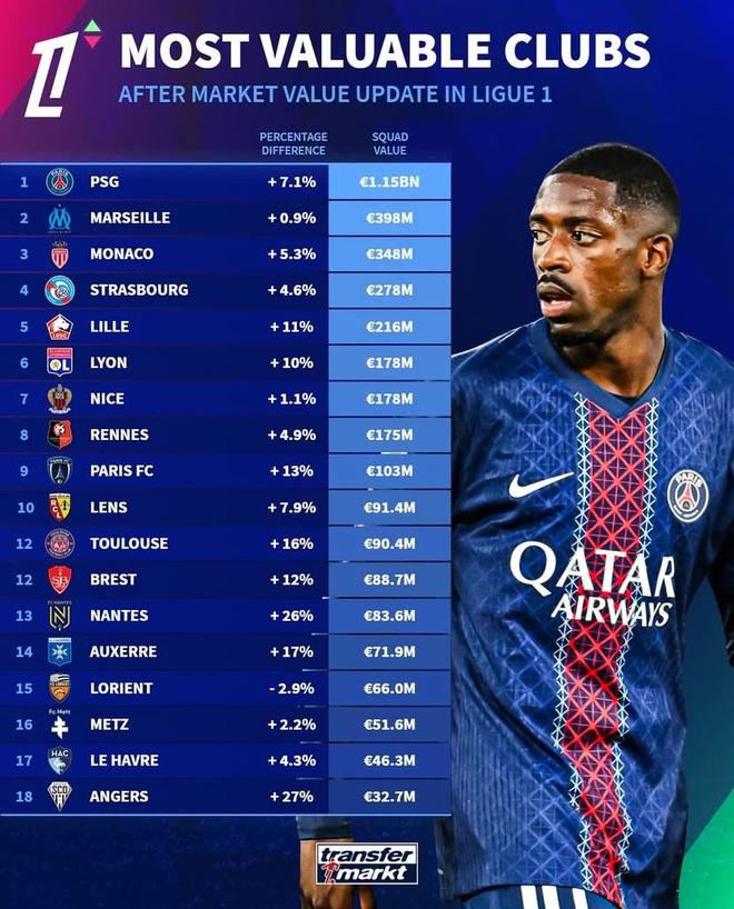 北京时间10月11日,周德更新了法甲球员的身价,同时还列出了法甲俱乐部的总身价排名。巴黎圣日耳曼排名榜首,马赛排名第二,摩纳哥排名第三。法甲俱乐部转会德国后排名: 1. 巴黎圣日耳曼 11.5 亿欧元(+7.1%) 2. 马赛 3.98 亿欧元(+0.9%) 3. 摩纳哥 3.48 亿欧元(+5.3%) 4. 斯特拉斯堡 2.78 亿欧元(+4.6%) 5. 里尔 2.16 亿欧元(+11%) 6. 里昂1.78亿欧元 (+10%) 7. 尼斯 1.78 亿欧元 (+1.1%) 8. 雷恩 1.75 亿欧元 (+4.9%) 9. 巴黎足球俱乐部 1.03 亿欧元 (+13%) 10. 朗斯 9140 万欧元 (+7.9%) 11. 图卢兹 9040 万欧元 (+16%) 12. 布雷斯特 8870 万欧元(+12%) 13. 南特 8360 万欧元 (+26%) 14. 欧塞尔 7190 万欧元(+17%) 15. 洛里昂 6600 万欧元(-2.9%) 16. 梅斯 5160 万欧元(+2.2%) 17. 勒阿弗尔 4630 万欧元(+4.3%) 18. 昂热 3270 万欧元(+27%)